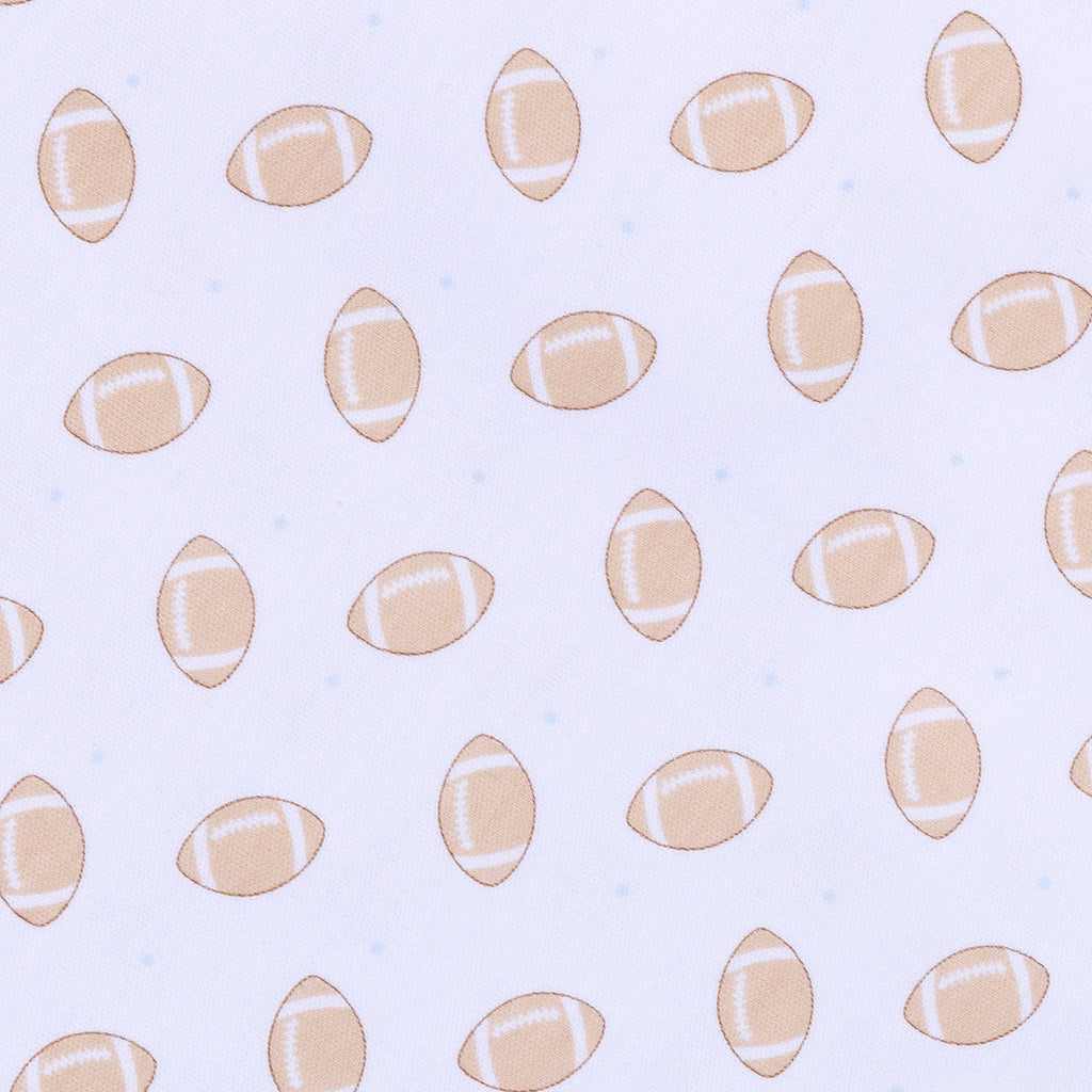 Score an easy win at bedtime with our sweet Touchdown Cutie Print Zip Footie! Crafted from luxurious Pima Cotton, this charming light blue footie features an all-over print of mini American footballs, and a convenient two-way zipper.