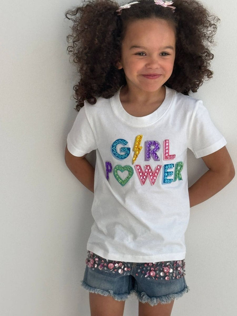 - Vibrant white t-shirt with a bold "Girl Power" design adorned with colorful crystal embellishments.