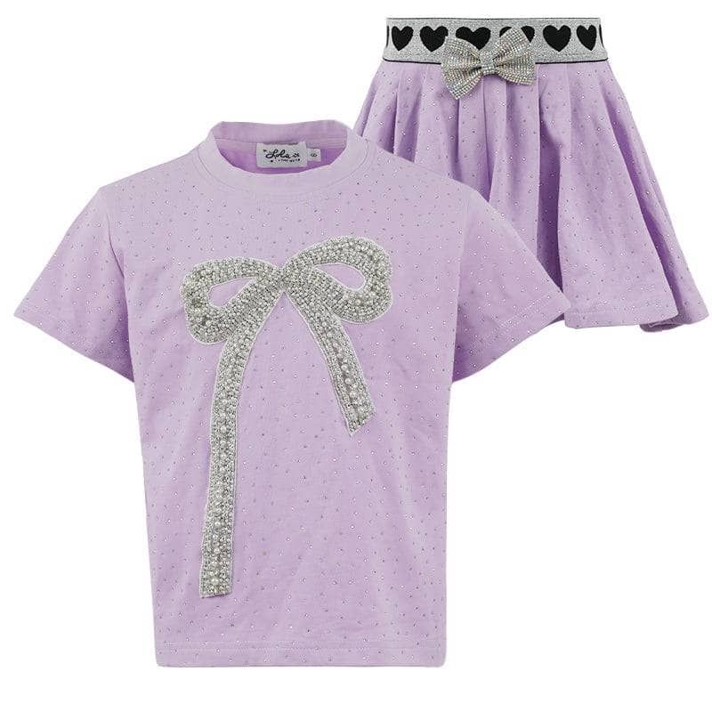 - Includes a short-sleeve top with a statement bow and a matching flared skirt with a heart-detailed waistband.