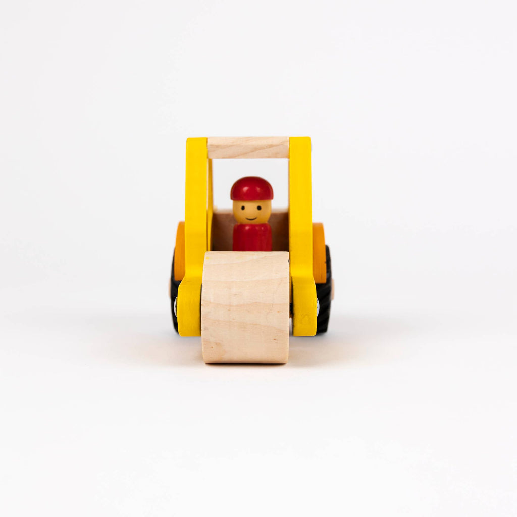 This wooden road roller truck is ready to flatten the road beneath it. Watch out, here he comes! Very sturdy for little hands.